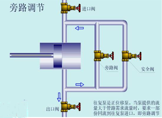 往復(fù)泵是正位移泵。當(dāng)泵提供的流量大于管路需求流量時(shí),要求一部分回流到往復(fù)泵進(jìn)口,及旁路調(diào)節(jié)。